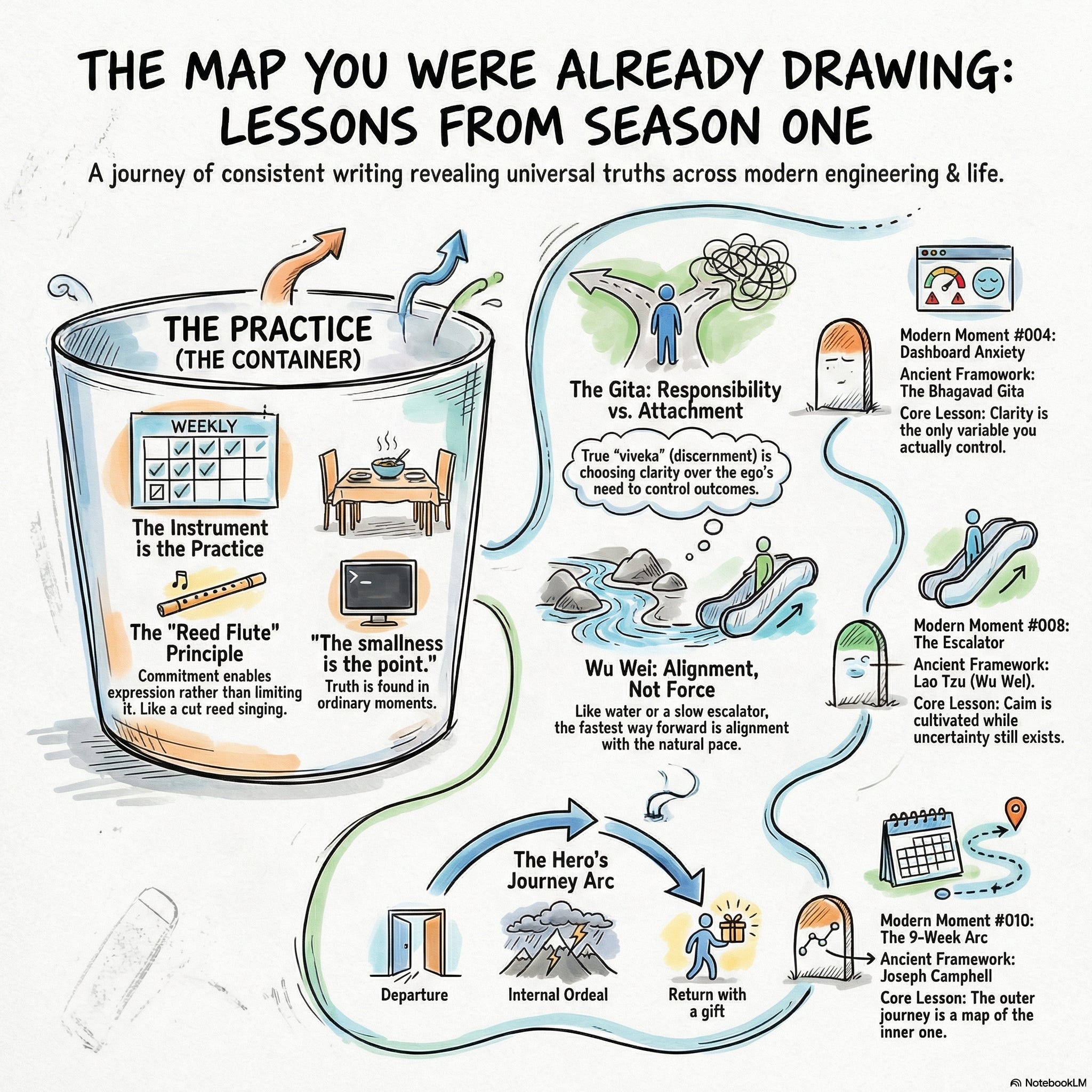 And underneath all of them — underneath Campbell’s arc and the Gita’s teaching and the river’s patient movement and the break that became the beginning — one question, asked nine different ways, in nine different weeks, by me, just trying to show up consistently: