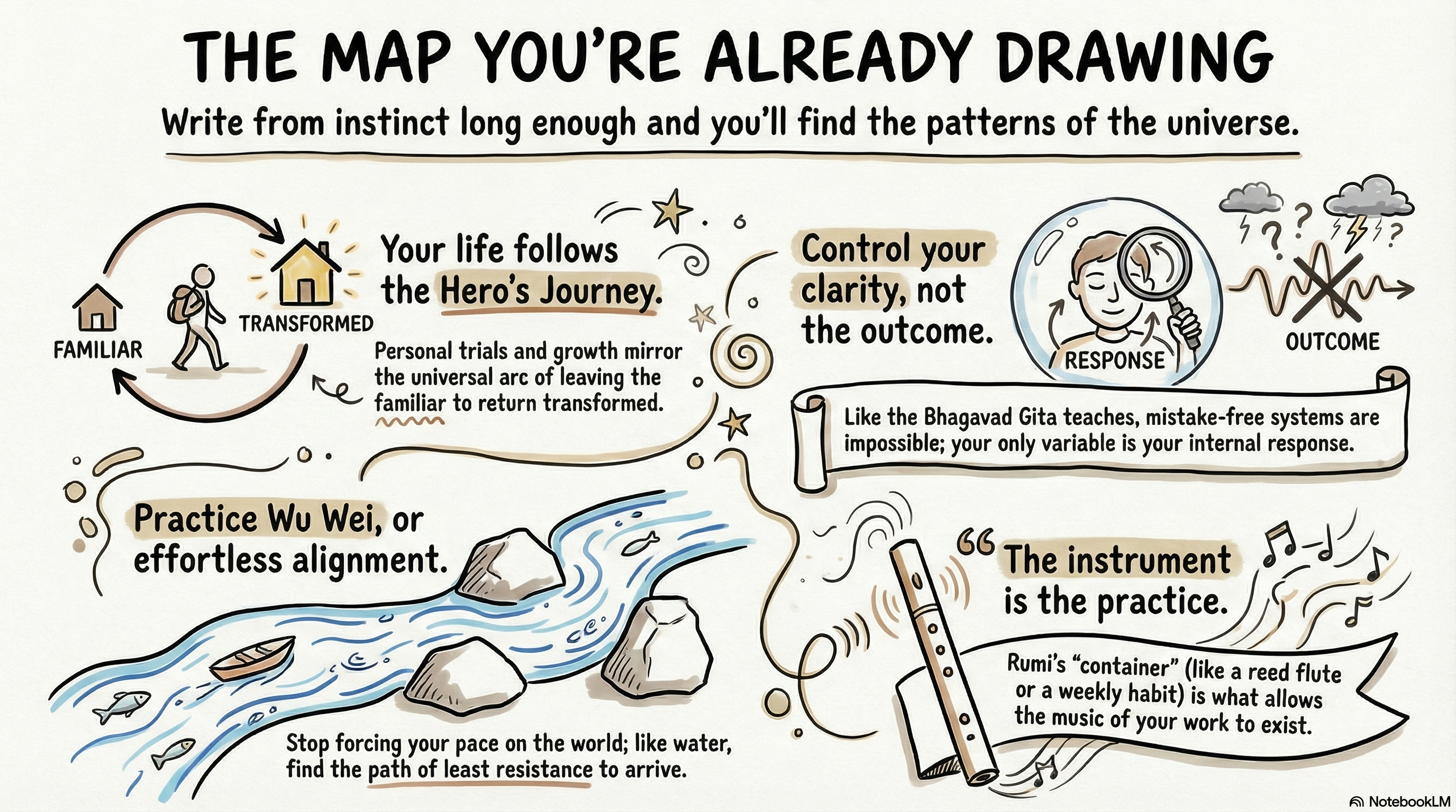 I wrote these pieces from instinct. From whatever the week gave me — a documentary, a commute, a dinner table, a terminal screen. I was not trying to trace a hero’s journey. I was not trying to illustrate the Gita. I had not read Lao Tzu.