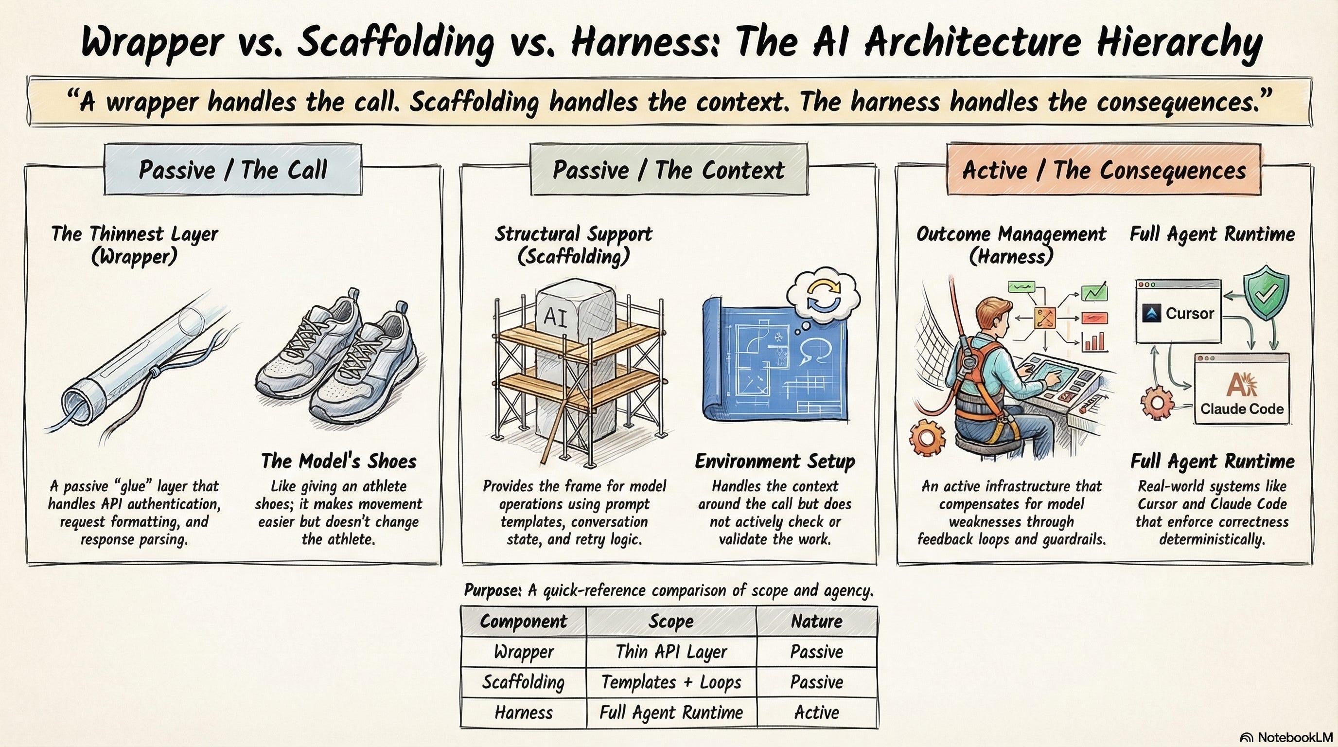 “A wrapper handles the call. Scaffolding handles the context. The harness handles the consequences.”